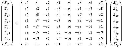 以上のようにすると、Sy0, …, Sy7 の計算は20回の掛け算でできることに なります。え? 掛け算は11回ですむはずだって? うーむ。まあいいでしょう(笑)。