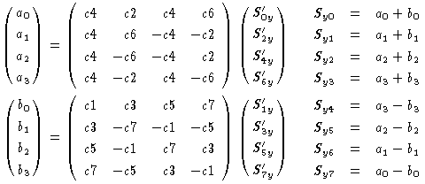 まず、c4=1 ですから、ここでは掛け算はいりません。また、この行列に 現れる係数は、c1,c2,c3,c5,c6,c7 の6種類しかないので、 掛け算用のテーブルを作ることもできます。 次に、上の行列を偶数列と奇数列に分けると、次のようになります。