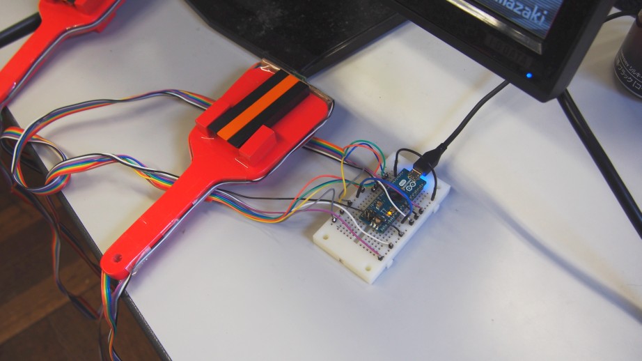 この加速度センサーはXYZ軸の加速度を検知してアナログ出力するもので、 Arduino Microというマイコンに接続して使用しています。 Arduino Microには12本のアナログ入力ピンが実装されているので、頑張れば 3軸×4本の鳴子を接続することができます。駒場祭では予算と時間の都合で 2本しか接続していませんが……