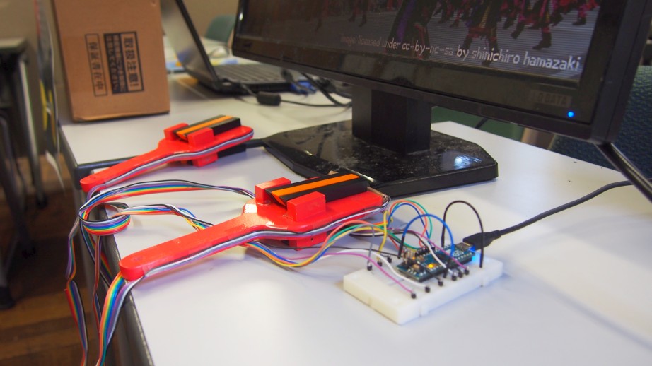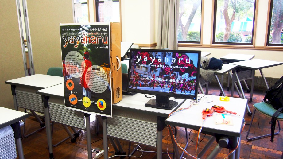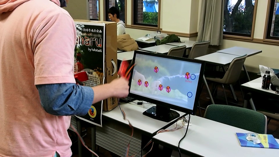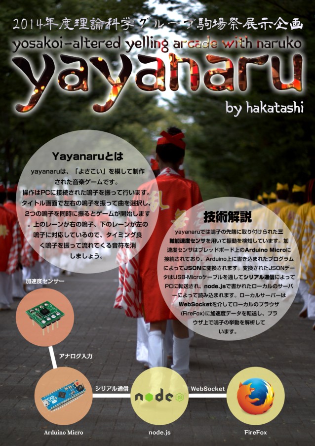 yayanaruは、第65回駒場祭で展示した、 よさこいを模して作った音楽ゲームです。 本物の鳴子にセンサーを取り付けてあり、画面上に流れる音符に合わせて鳴子を振ると、 センサーが反応し、音符が消えて得点を得ることができます。
